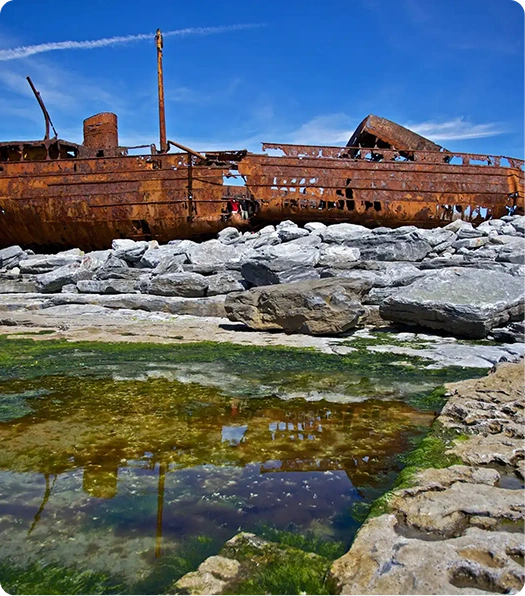Beached on the rocks since 1960, the rusted shell of the MV Plassey is one of the island’s most iconic sights. It famously featured in the opening credits of Father Ted and is now a must-visit photo spot, especially at sunset.